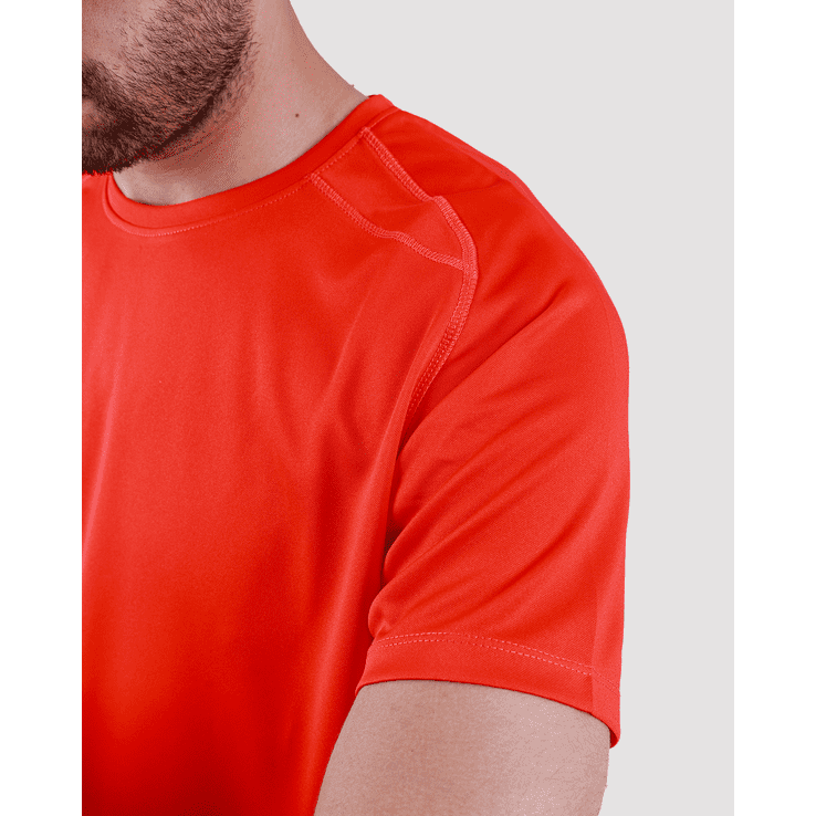 Our fiery Red short-sleeve T-shirt has Moisture management -Anti-microbial technology which makes it dry quickly, keeping you cool during the workout, the fit hugs snuggly around the body while leaving room for comfort in the sleeves and waist.
